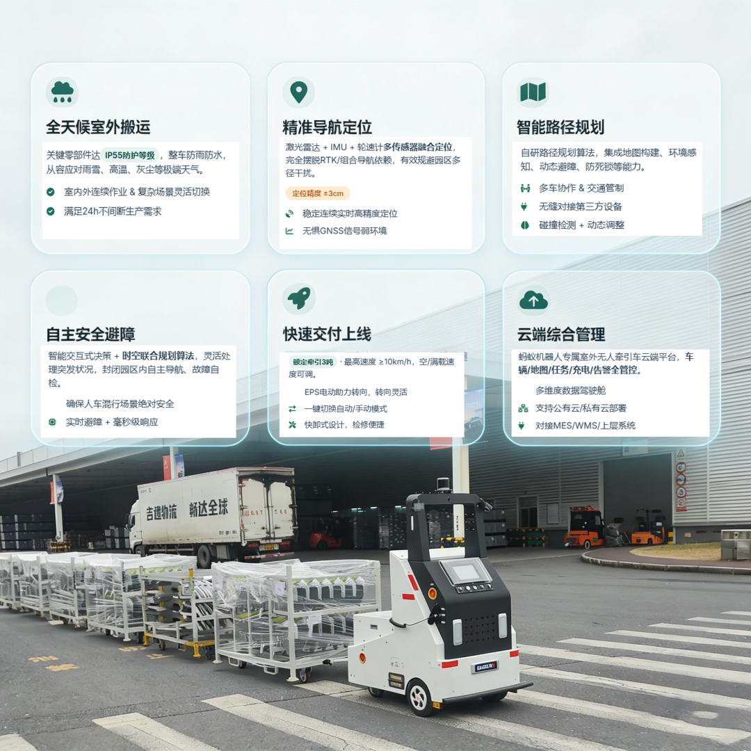从人工驾驶到无人牵引,从室外洼地到智慧高地,吉利汽车与蚂蚁机器人的合作打造l了室外园区智慧物流的新标杆,未来蚂蚁机器人将持续深耕智慧搬运领域,以更先进的技术、更可靠的方案,助力更多制造企业实现物流升级与智造转型。
