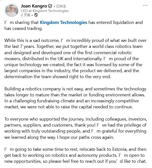 事实上,Kingdom Technologies的倒下并非个例。2025年以来,尽管割草机器人赛道仍被资本与行业视为“蓝海领域”,但国内外已有多家企业相继关停倒闭,赛道洗牌态势愈发明显。国内市场方面,2025年上半年,专注于家用智能割草机器人的森合创新因资金链断裂宣布停止运营,其曾凭借高颜值设计和亲民定价收获不少消费者关注,但受限于研发投入不足、供应链管控能力薄弱,难以应对市场竞争;同年年中,杭州苏珀曼智能科技等初创企业也相继关停,均因融资不及预期、市场拓展受阻、产品迭代滞后等问题黯然退场。